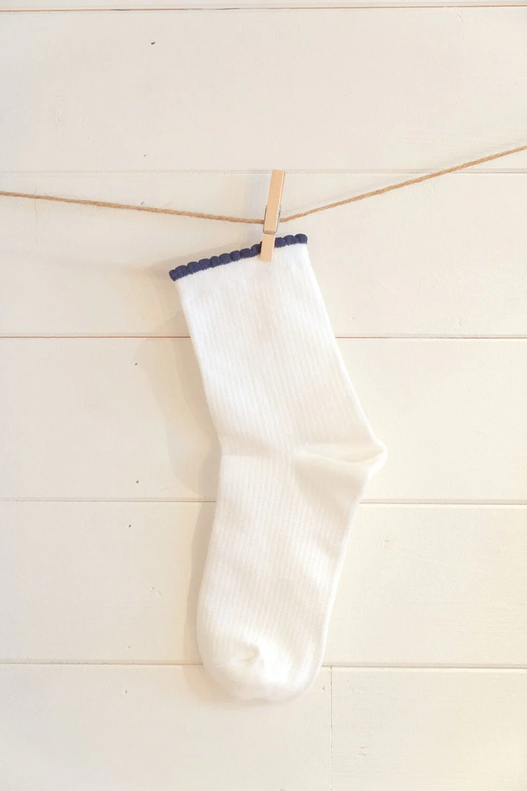 Soft white basic ankle socks with navy blue trim.All accessories are final sale.Fabrics: 80% cotton, 20% spandexMeasurements: One sizeMade In: China
