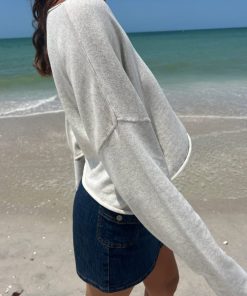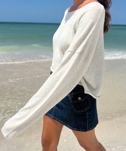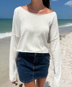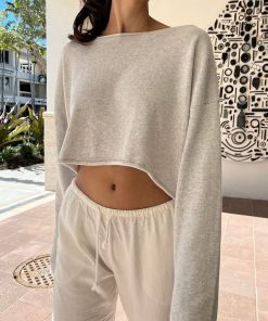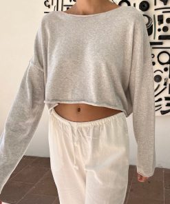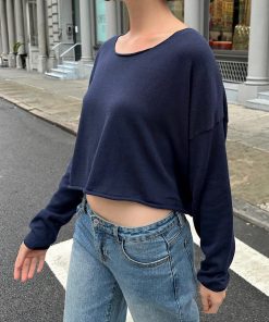 Lightweight soft cropped wide neck sweater with raw hem.Fabrics: 100% cotton Measurement: 17.5″ (44cm) length, 28″ (71cm) bustMade in: China