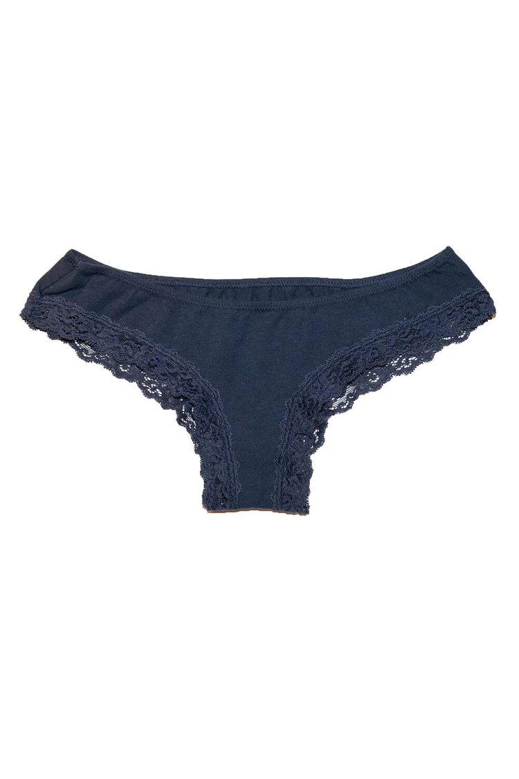 Soft cotton navy blue undies with a lace trim.All intimates are final sale.Fabrics: 96% cotton, 4% elastaneMeasurement: 9.5″ (23cm) rise, 28″ (71cm)waist (stretches)Made in: Italy