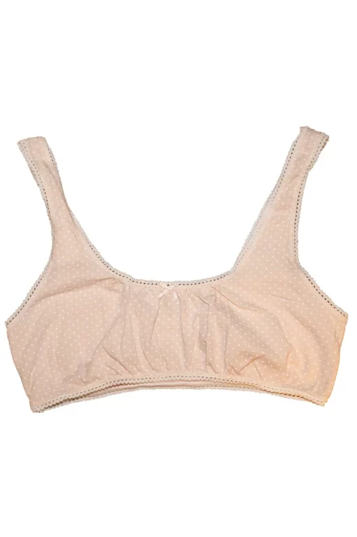Pink bra with white polka dots, scalloped trim and straps, and white bowAll intimates are final sale.Fabrics: 100% cottonMeasurements: 12″ (31 cm) length, 13″ (33 cm) bust Made in: Europe