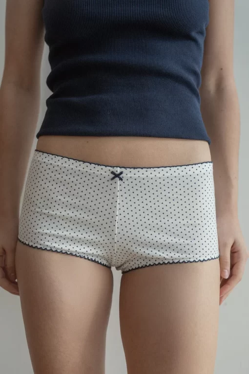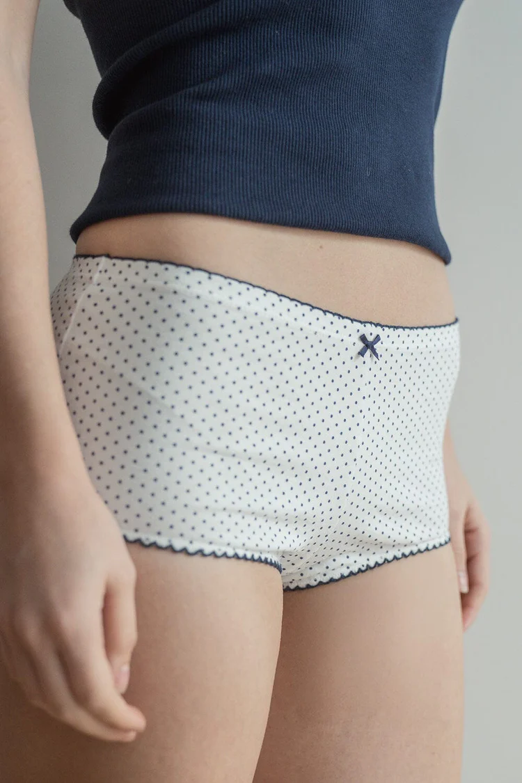 Soft cotton, 'hipster' style undies with white polka dots pattern, scallop trim and a bow detail. All intimates are final sale.Fabrics: 100% cottonMeasurement: 4″ (10cm) rise, 20″ (51cm) waist (stretches)Made in: Italy