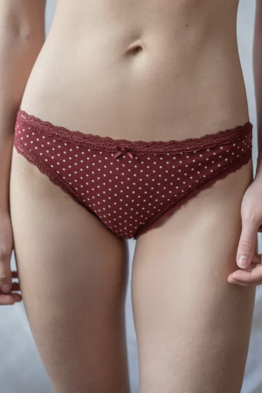 Soft, polka dots, cotton underwear with an elastic waistband, lace trim and a bow.All intimates are final sale.Fabrics: 96% Cotton, 4% ElastaneMeasurement: 8.5″ (21.5 cm) rise, 10″ (25.4 cm) waist (stretches)Made in: Europe