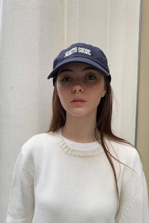 Navy blue, six-panel, baseball cap with the North Shore graphic embroidered in white. Adjustable in the back, exposed stitching on the brim.Fabrics: 100% cottonMeasurement: 3″ (8 cm) brim length, 8.5″ (22 cm) diameterMade In: China