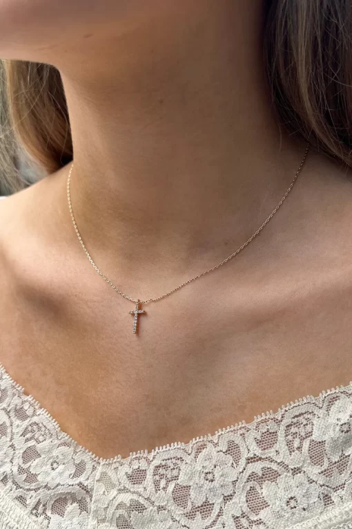 Dainty chain necklace with a small faux rhinestone cross charm and adjustable lobster clasp closure.All accessories are final sale.Fabrics: Lead, nickel, and cadmium compliantMeasurements: 16″ (41 cm) full lengthMade in: China