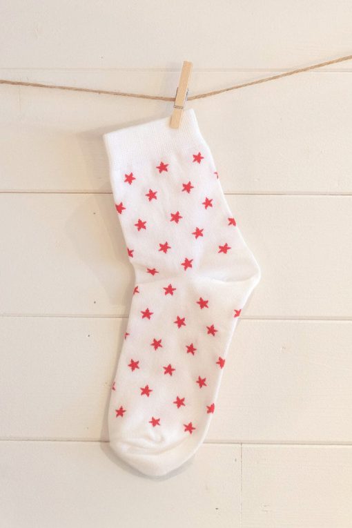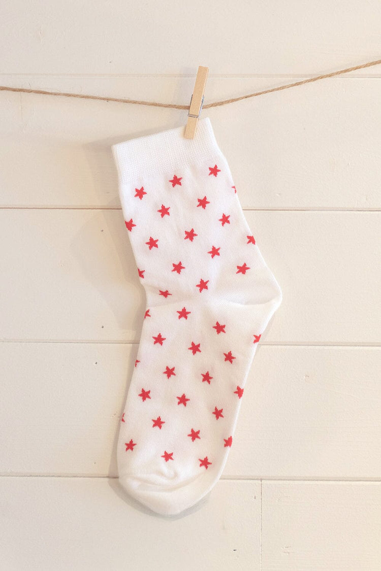 Soft white socks with red stars.All accessories are final sale.Fabrics: 80% cotton, 20% spandexMeasurements: One sizeMade In: China